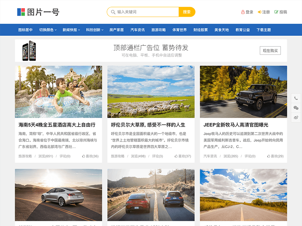 圖片一號是一款由主題巴巴團隊原創(chuàng)設(shè)計開發(fā)的WordPress圖片資訊主題,這款主題采用全新的自適應(yīng)設(shè)計布局,支持文章投稿功能,主題內(nèi)置多個廣告位,文章頁內(nèi)置強大、漂亮的圖片相冊功能。通過后臺的主題設(shè)置面板,您可以輕松自定義各種主題選項。如果你正希望搭建一個漂亮、好用、專業(yè)的圖片網(wǎng)站、圖片資訊網(wǎng)站、博客、自媒體網(wǎng)站或個人站點,那么這款圖片一號WordPress主題將會是一個很好的選擇。