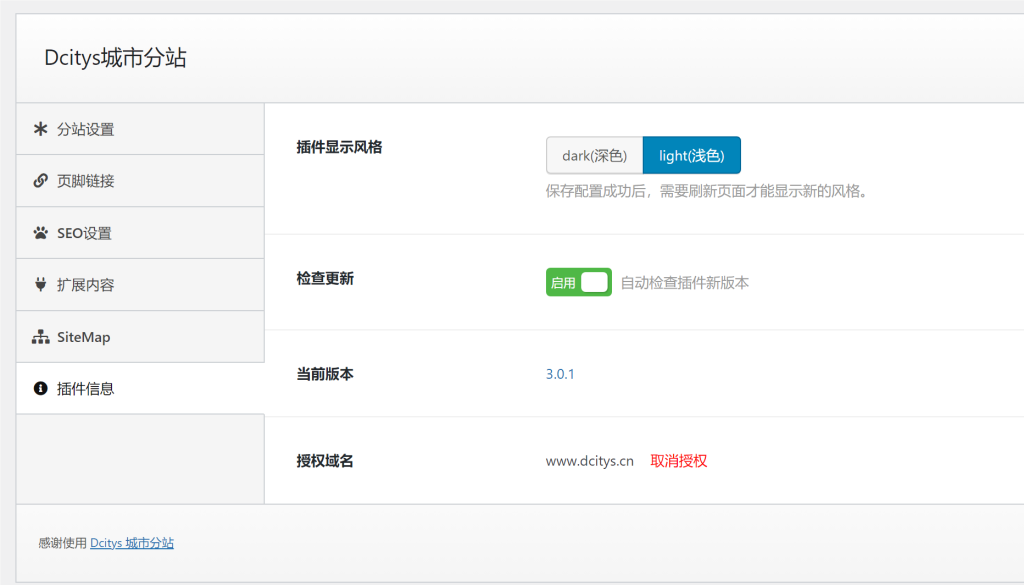 Dcitys城市分站 3.0 采用新的后臺(tái)框架重新設(shè)計(jì)開發(fā),操作及基本樣式與以前版本非常相似,新版本增加了取消授權(quán)、插件風(fēng)格設(shè)置。