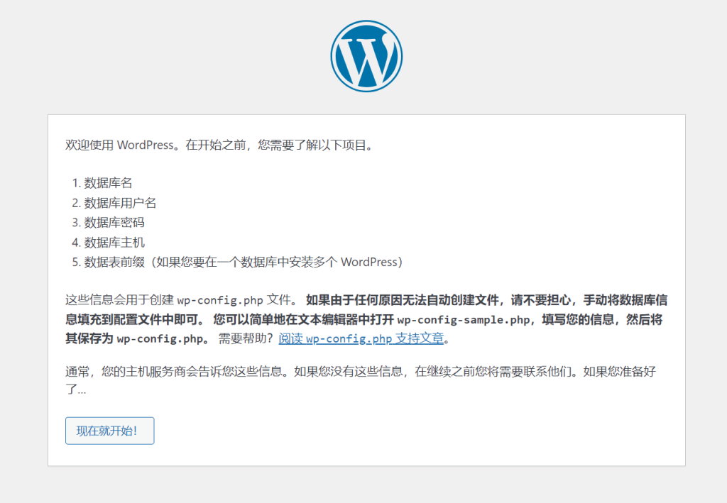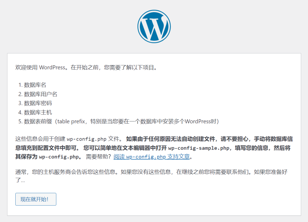 6、解壓后訪問域名,進(jìn)行WordPress的安裝,出現(xiàn)下面的頁面時(shí)點(diǎn)擊現(xiàn)在就開始,(下載WordPress版本不同,有的可能需要先選擇網(wǎng)站語言,中文在最下面)