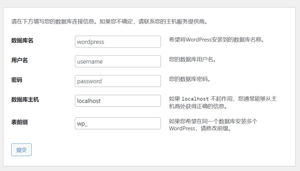 4、設(shè)置數(shù)據(jù)庫信息,注意數(shù)據(jù)庫主機(jī)的設(shè)置,如果一個(gè)數(shù)據(jù)庫中安裝多個(gè)wordpress時(shí),可以設(shè)置不同的表前綴。