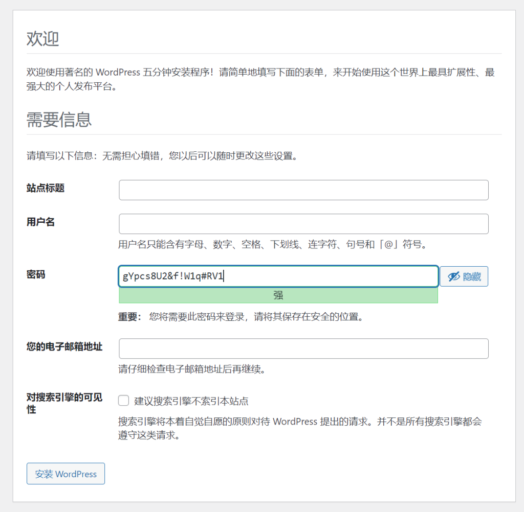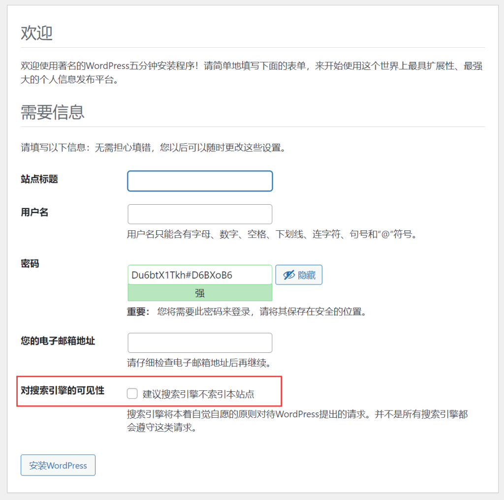 9、填寫網(wǎng)站標(biāo)題、用戶名、密碼,注意對(duì)搜索引擎的可見性一定不要勾選,