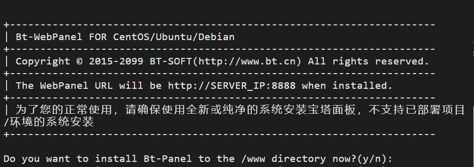 輸入安裝代碼后,按回車后,稍等一會(huì)出現(xiàn)如下提示,就是安裝寶塔面板要?jiǎng)?chuàng)建一個(gè)www目錄,輸入y 在按回車鍵。