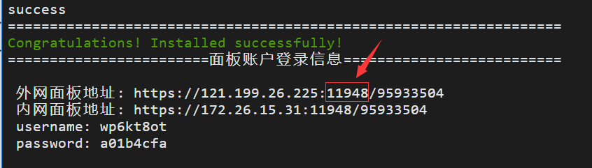 等出現(xiàn)下面的提示說明,寶塔面板已安裝成功,里面包含寶塔面板的登錄地址,用戶名和密碼,