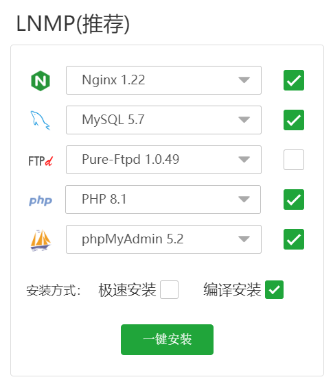 登錄后,需要同意寶塔的安裝協(xié)議并綁定寶塔賬號(hào),如果沒有寶塔賬號(hào)需要先注冊(cè)一個(gè),登錄后會(huì)彈出軟件安裝的界面,可以按下面的進(jìn)行勾選,選擇編譯安裝雖然慢,但比較穩(wěn)定,