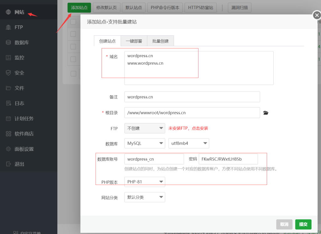 安裝完成后在網(wǎng)站中,添加網(wǎng)站,如果點(diǎn)擊添加網(wǎng)站出現(xiàn)提示安裝服務(wù)器軟件時(shí),需要在軟件中再次安裝Nginx軟件。輸入域名、選擇數(shù)據(jù)庫和PHP版本等。