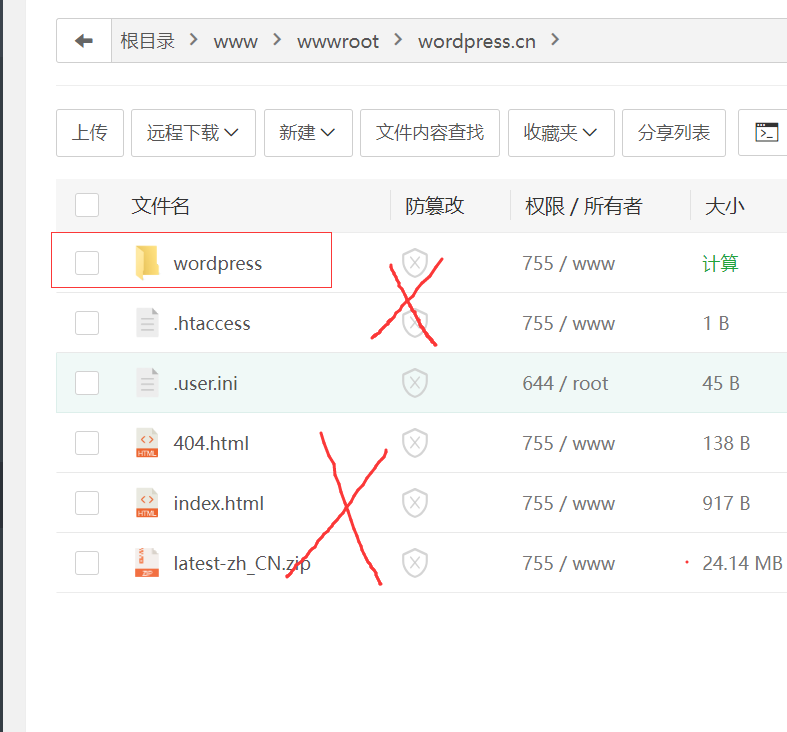 2、下載后上傳壓縮包到服務(wù)器進(jìn)行解壓,解壓后代碼在 wordpress 目錄中,要進(jìn)行調(diào)整,否則會(huì)出現(xiàn)訪問不到的情況。把代碼復(fù)制到網(wǎng)站運(yùn)行目錄中。